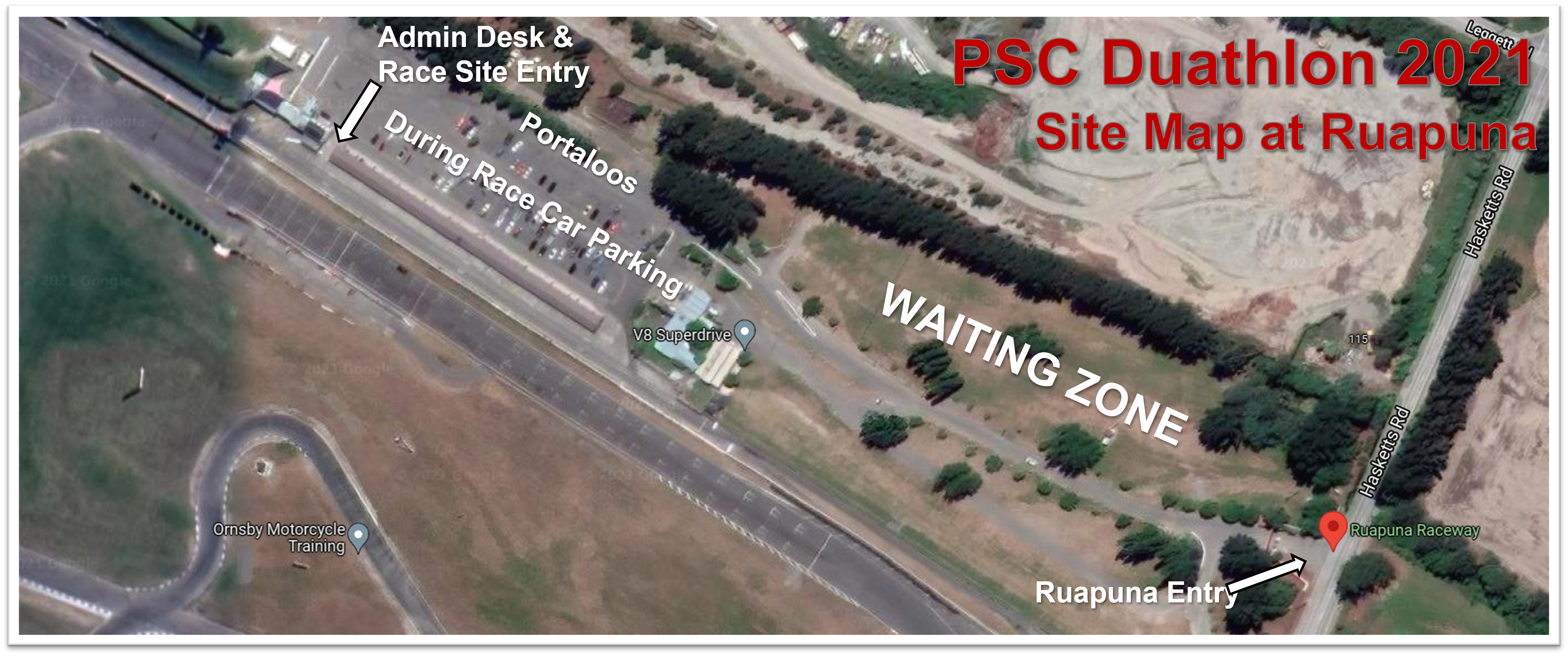 Parking: Please refer to map below. The waiting zone is where parents/transport can come in and park up waiting for time slot to start. Then children can be dropped off in the carpark, children and race manager only to come past the carpark.